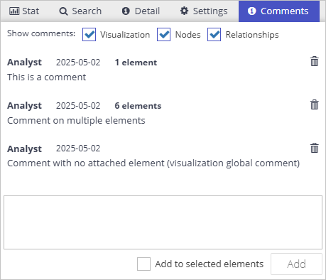 The right control panel now has a new tab for graph commenting. Comments can be attached to the visualization as a whole or to groups of nodes and relationships and are saved with the visualization, not affecting the graph database data. This provides an easy and effective way to store notes about elements or patterns and share them with others in the team.