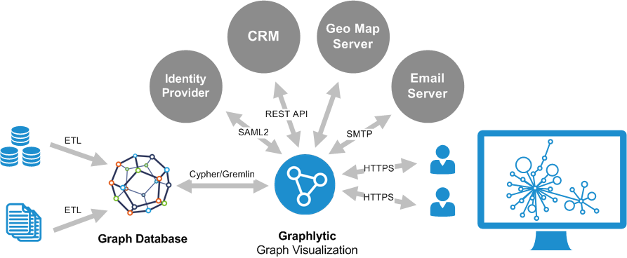 Graphlytic can be integrated with several external systems for various tasks and processes like SMTP integration for self-service password resetting or SAML2 integration for single sign-on. Read more about all the integration options in our Integrations documentation.