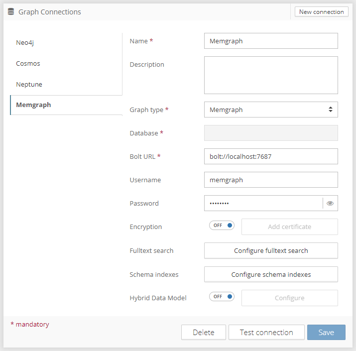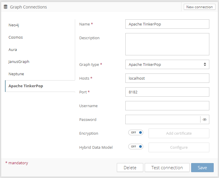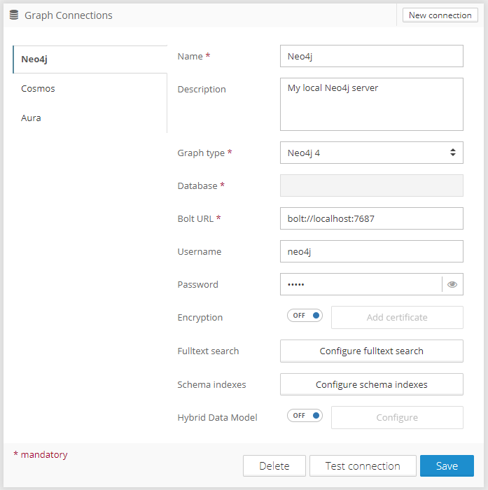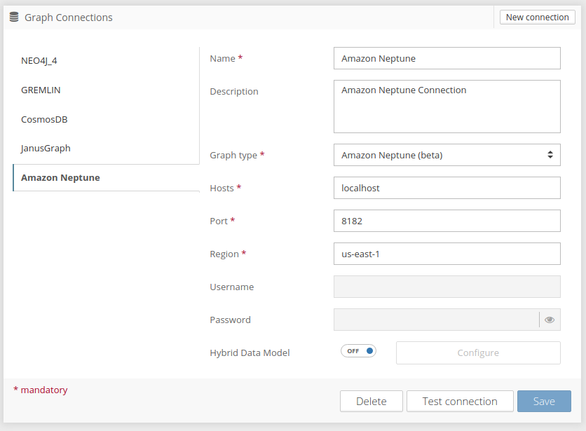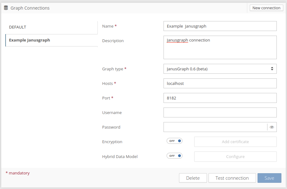 Hybrid Data Model | N / A | Hybrid Data Model configuration for this Graph Database connection. For more information please see the "Hybrid Data Model" chapter below. |