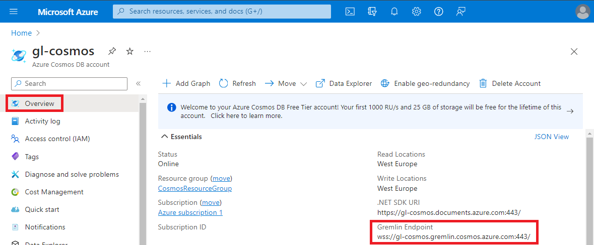 Hosts | someapp.gremlin.cosmos.azure.com | Graph Database hosts value without the protocol. Make sure to provide gremlin host, as CosmosDB provides multiple hosts. The value can be found on the “Overview” page in Azure. See the next chapter for more details. |