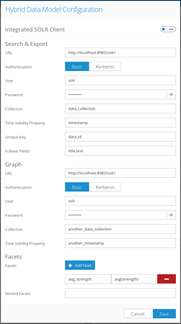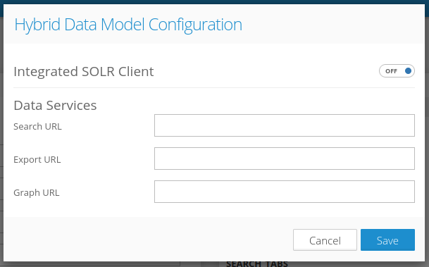 When the integrated SOLR client is enabled, the modal window displays these configuration options: