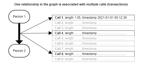 As an example imagine the visualization of phone logs, where nodes are persons and relationships are individual calls from the log. This approach is very straightforward but usable only for a smaller number of calls. With potentially thousands of calls between some persons, this model can quickly run into performance issues on the graph database level or in the visualization. One solution is to have only one relationship between any two persons that have communicated at least once and calculate aggregated values like the number of calls, the average length of a call, etc. But then adding new calls and doing time-slicing becomes a computationally intensive task requiring more resources. Graphlytic's Hybrid Data Model is a balance between a lean graph model and the possibility to do fast time-slicing, accessing the detailed data anytime, and have near-real-time results.
