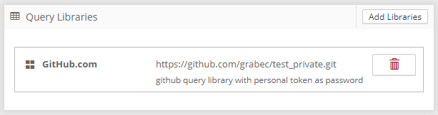 A Query Library is a GIT repository connected to a Project. Queries defined in such a library are available on the Queries page and in the Search Menu in visualization. Queries from a library can be used to query and visualize data like any other query defined in a Project.