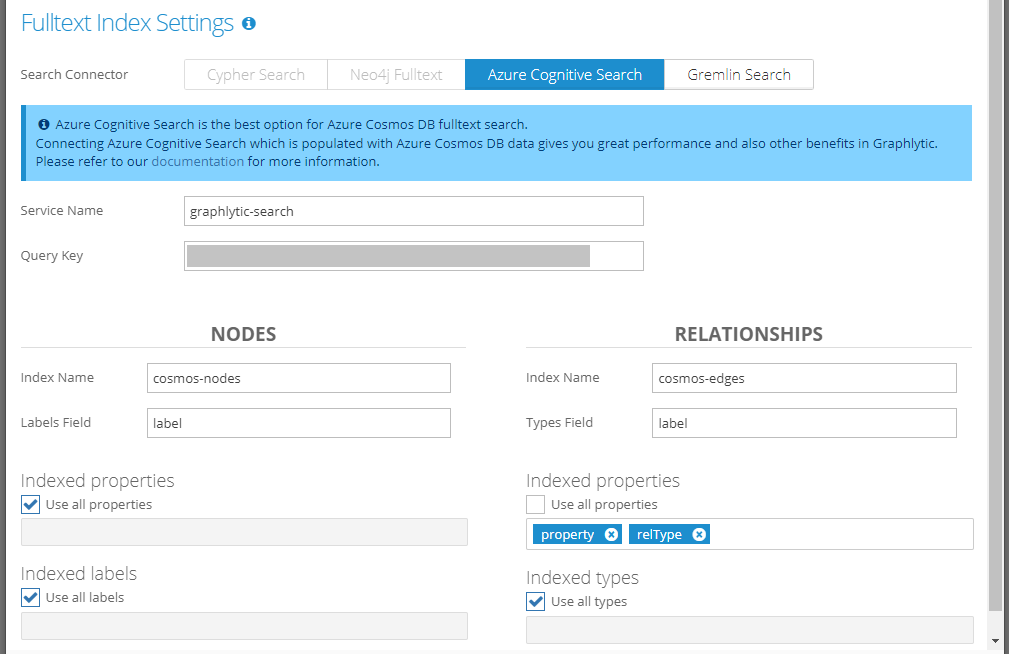 Azure Cognitive Search | All graph DBs. Mainly for Cosmos DB. | Uses Azure Cognitive Search as an external search engine. Data has to be periodically imported into the Azure Cognitive Search service to ensure consistency between your graph DB and search indexes (Graphlytic is not doing this out of the box, the connection and data importing have to be done by the user). This search connector is best with Cosmos DB because Azure has multiple tools how to easily connect Cosmos DB and Azure Cognitive Search. |