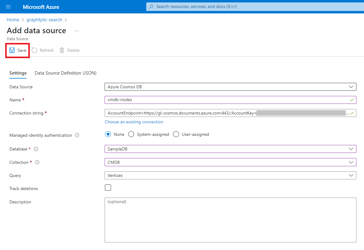 Add new Data Sources - create two data sources connected to your Cosmos DB - one for nodes (vertices) and one for relationships (edges). Tip: Use “Choose an existing connection” to easily select your Cosmos DB.