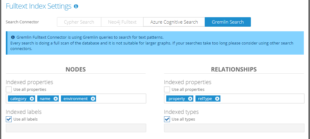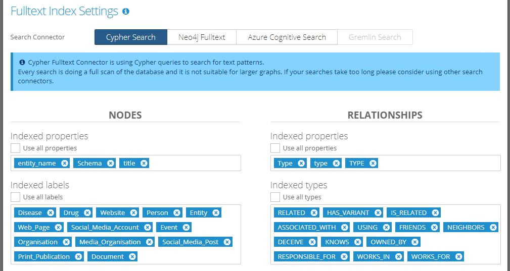 Indexed labels - list of node labels that are used in the search query. Only properties of nodes with these labels will be searched.