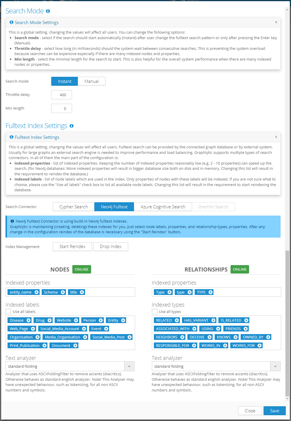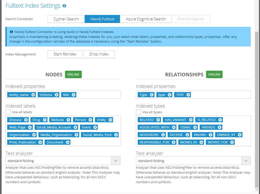 Text analyzer - analyzer used for creating the index in Neo4j. Changing the analyzer will change the search experience. For instance, some of the analyzers are case-sensitive, some of them have specific stop words for certain languages, etc.