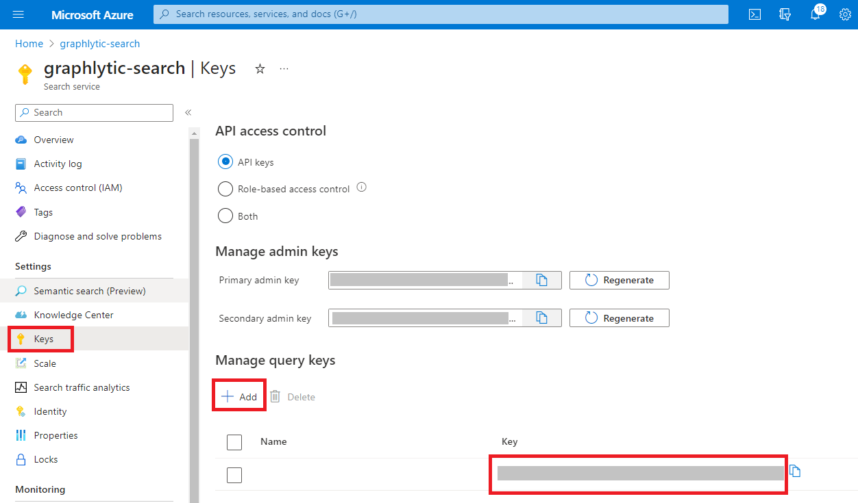 Where to find the Query key in Azure? Go to the Keys page and create a query key that can be used in Graphlytic.
