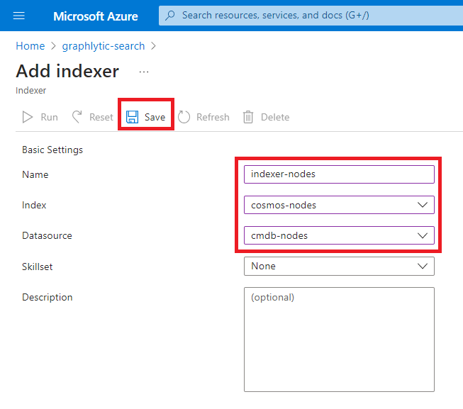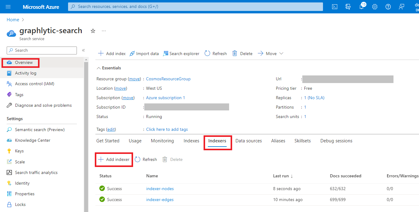4. Add Indexers - Indexers are automatic jobs that are importing data from Cosmos DB into the Azure Cognitive Search indexes. Create two Indexers - one for nodes (vertices) and one for relationships (edges). Example of an indexer configuration in in picture below.