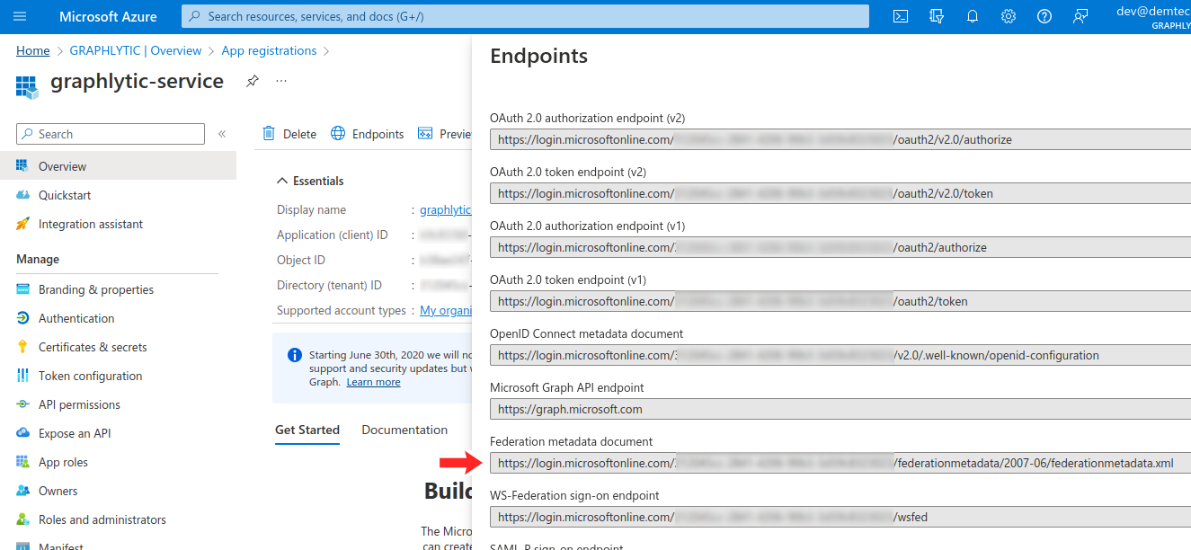 Federation Metadata URL | https://login.microsoftonline.com/87654321-4321-4321-4321-3d7hh723f7/federationmetadata/2007-06/federationmetadata.xml | Publicly available XML document that contains most of the information needed to connect Graphlytic to Azure Entra ID. See chapter “3.1. Federation Metadata document URL” below for more information. |