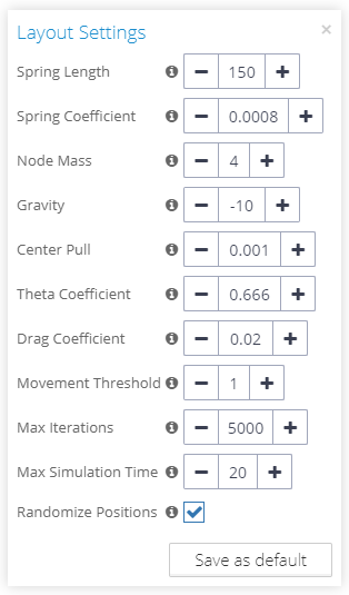 Selected nodes will be laid out by the gravity algorithm. The result of this algorithm should be different every time. This algorithm works iteratively and every change between every iteration is animated by moving the nodes and relationships. This layout stops after a certain period of time because in large graphs this algorithm could take a very long time to find the best result.